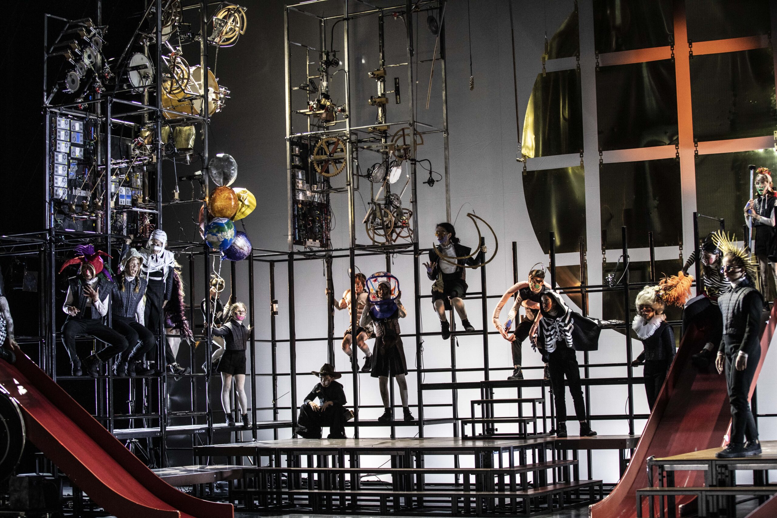 Au cours d’une performance à la croisée du mécanique et du vivant, le fabuleux mécanisme de l’Avenir nous le dira se dévoile sous la forme d’une gigantesque machine à oracles qui crache des sons et une trentaine d’enfants-chanteurs. Comme à l’abandon sur une île déserte, ces jeunes gens s’apprêtent à vivre une étonnante traversée météorologique et émotionnelle. Ils vont faire l’expérience de la dérégulation à toutes les échelles… Partout, les intempéries sévissent, qu’elles soient d’ordre climatique ou qu’elles relèvent de conflits internes